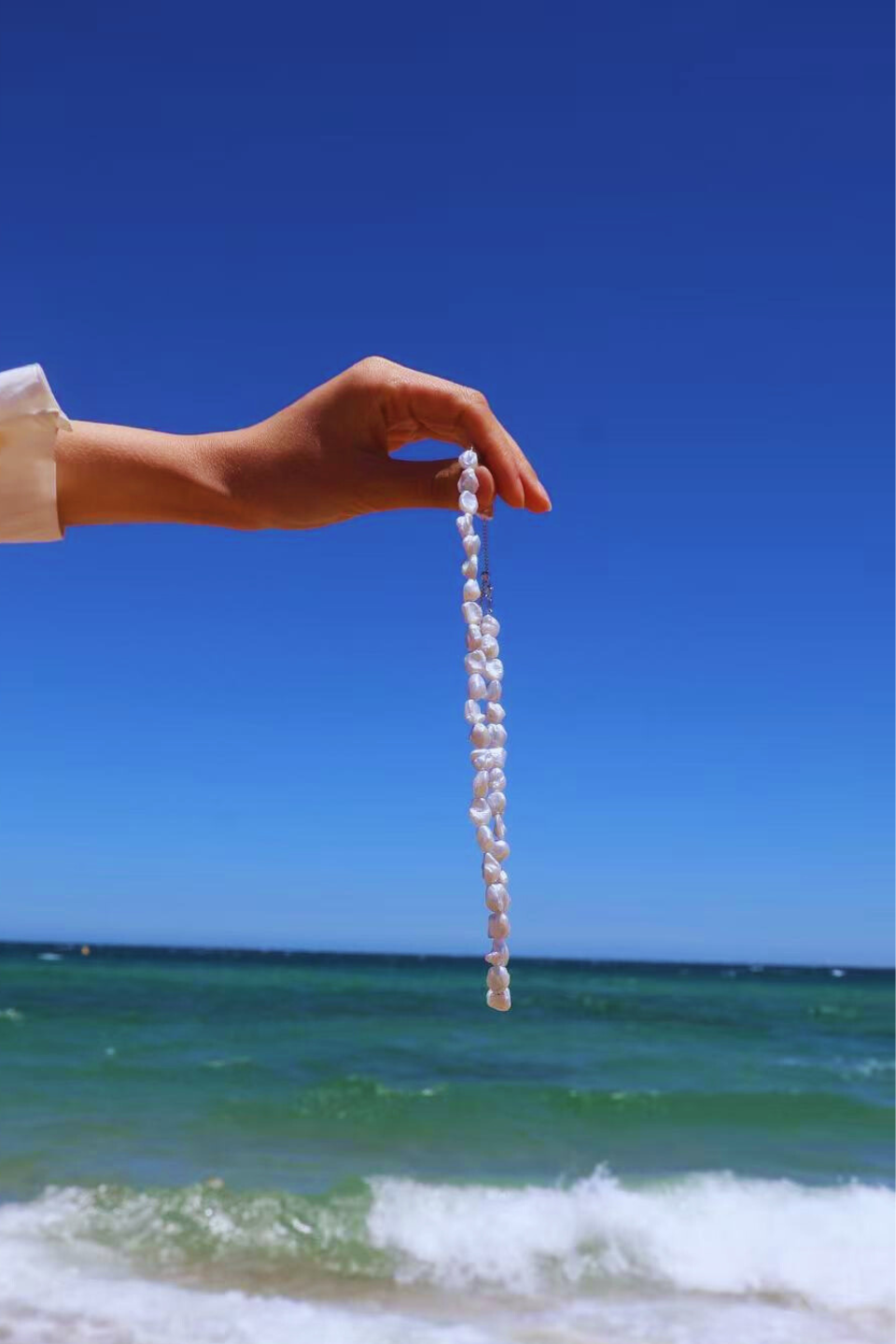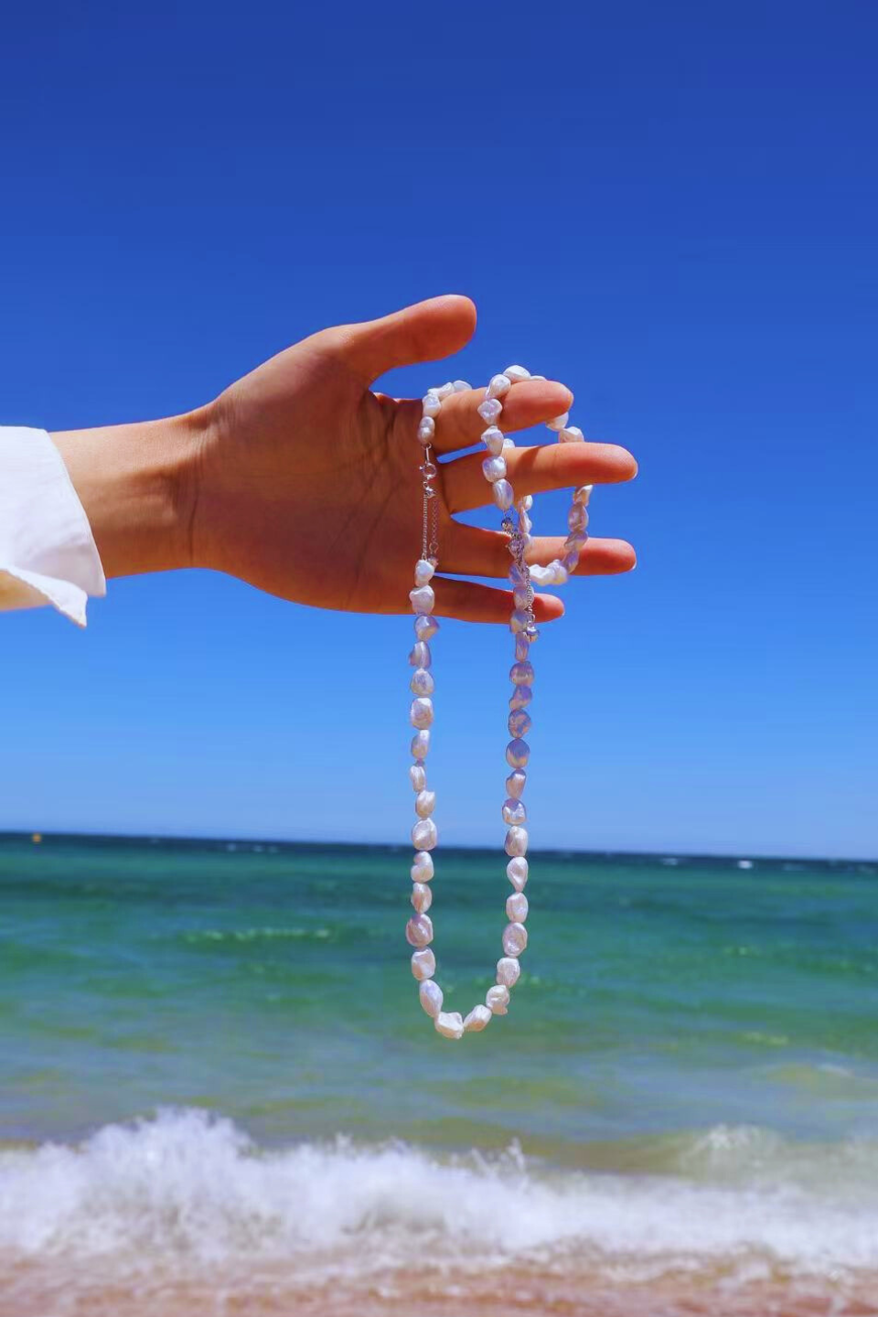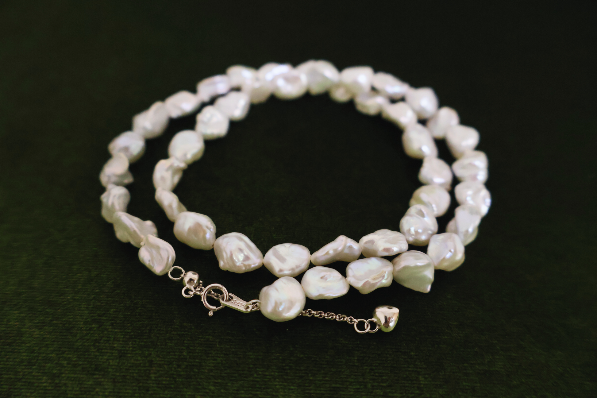 Crafted entirely in sterling silver, this necklace balances strength and subtlety. The irregular pearls create a rhythm that feels modern and intentional, celebrating individuality without excess. Clean in structure and rich in character, it’s designed to sit close to the skin and move naturally with you.