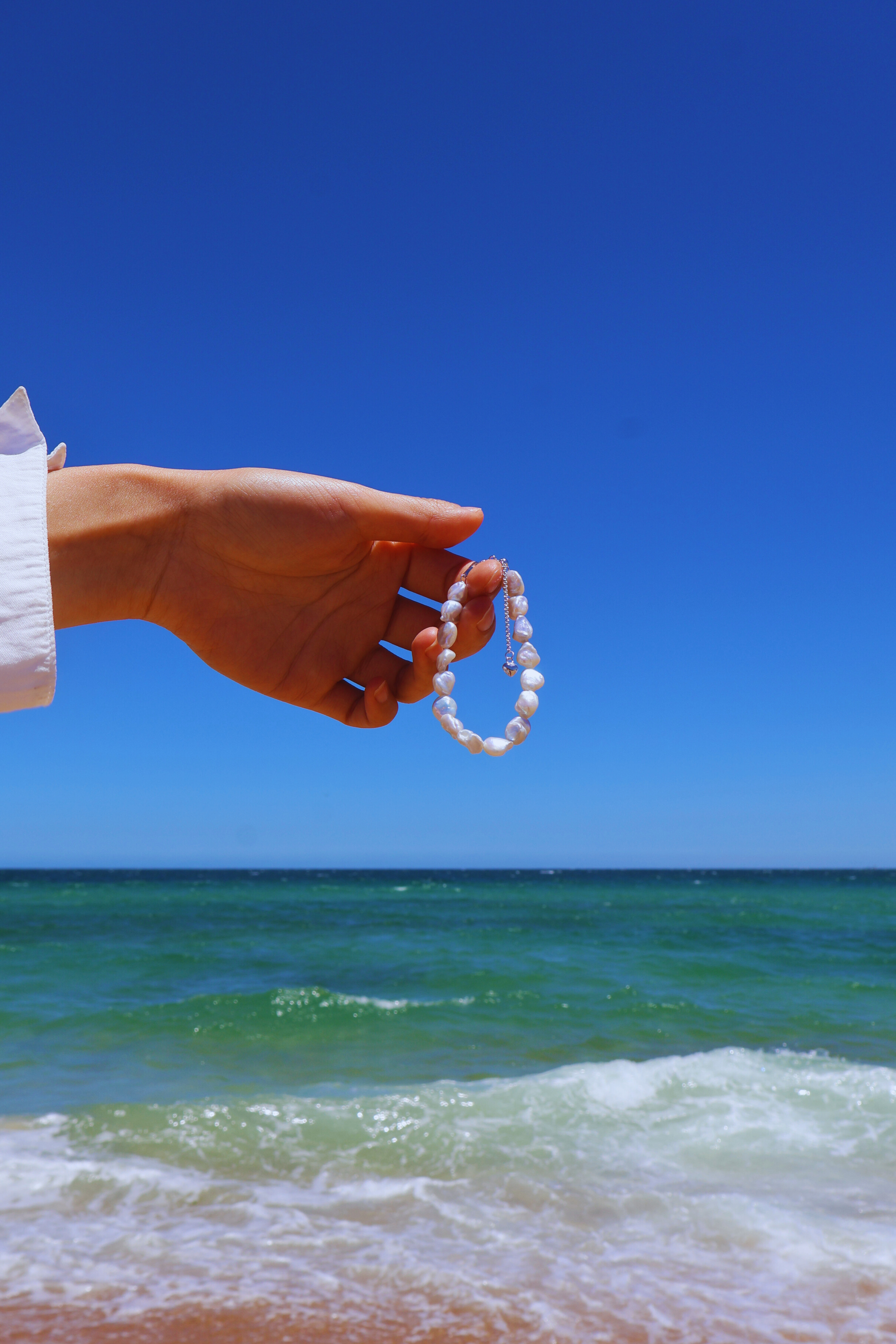 Blue Blood features crushed-silver baroque pearls — fragmented, reflective, and unapologetically individual. Each pearl carries a metallic lustre reminiscent of scattered silver light, creating a bold yet restrained presence on the wrist.
