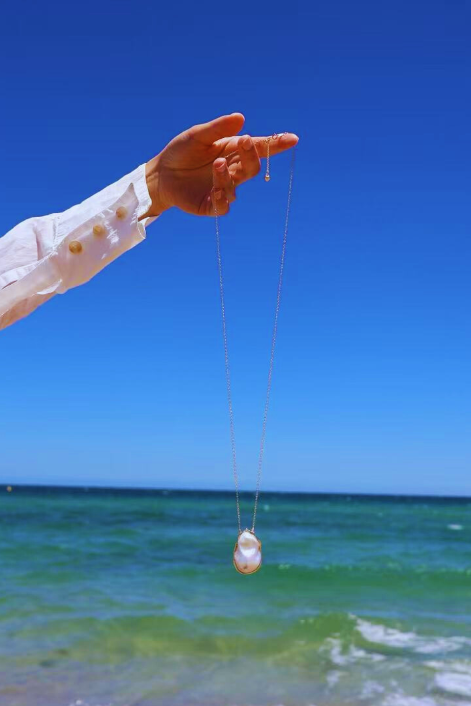 Golden Frame features a luminous large baroque pearl, delicately encased in an 18K gold edge setting that traces its organic silhouette. The gold frame enhances the pearl’s natural form without overpowering it — a balance of structure and softness, intention and individuality.