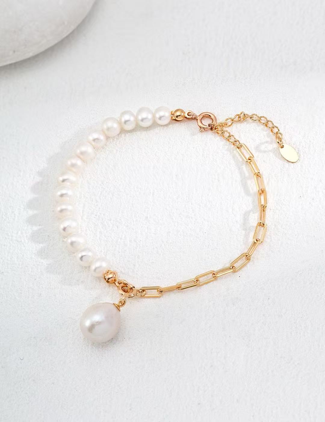 A strand of delicate freshwater pearls meets a refined chain, finished with a single drop pearl that moves softly with the wrist.