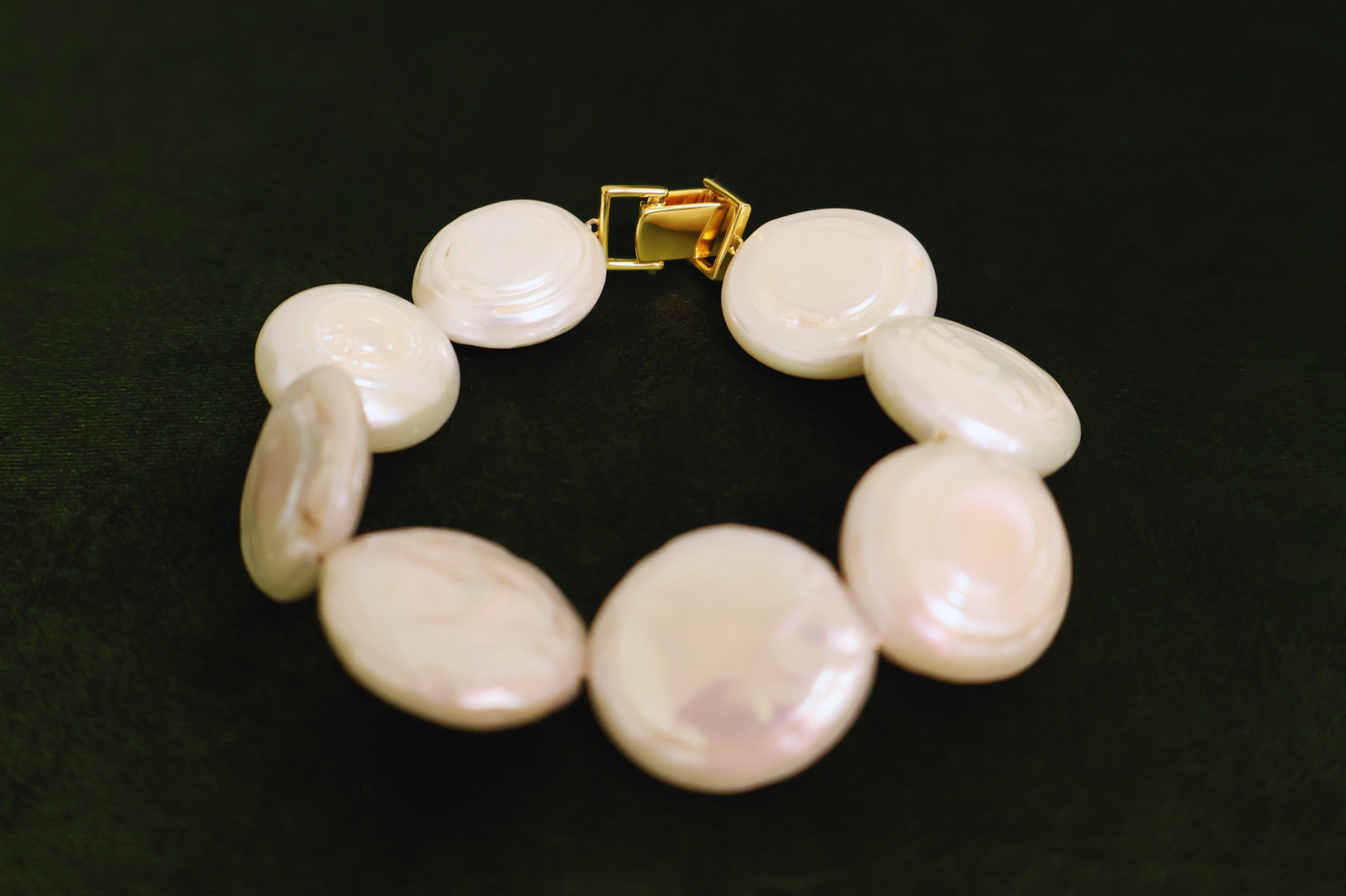 Inspired by the effortless elegance of a Roman holiday, this bracelet features a luminous coin-shaped baroque pearl — soft in glow, organic in form, and rich in character. Set on a fully 18K gold-plated sterling silver chain, it reflects warmth, refinement, and quiet sophistication.