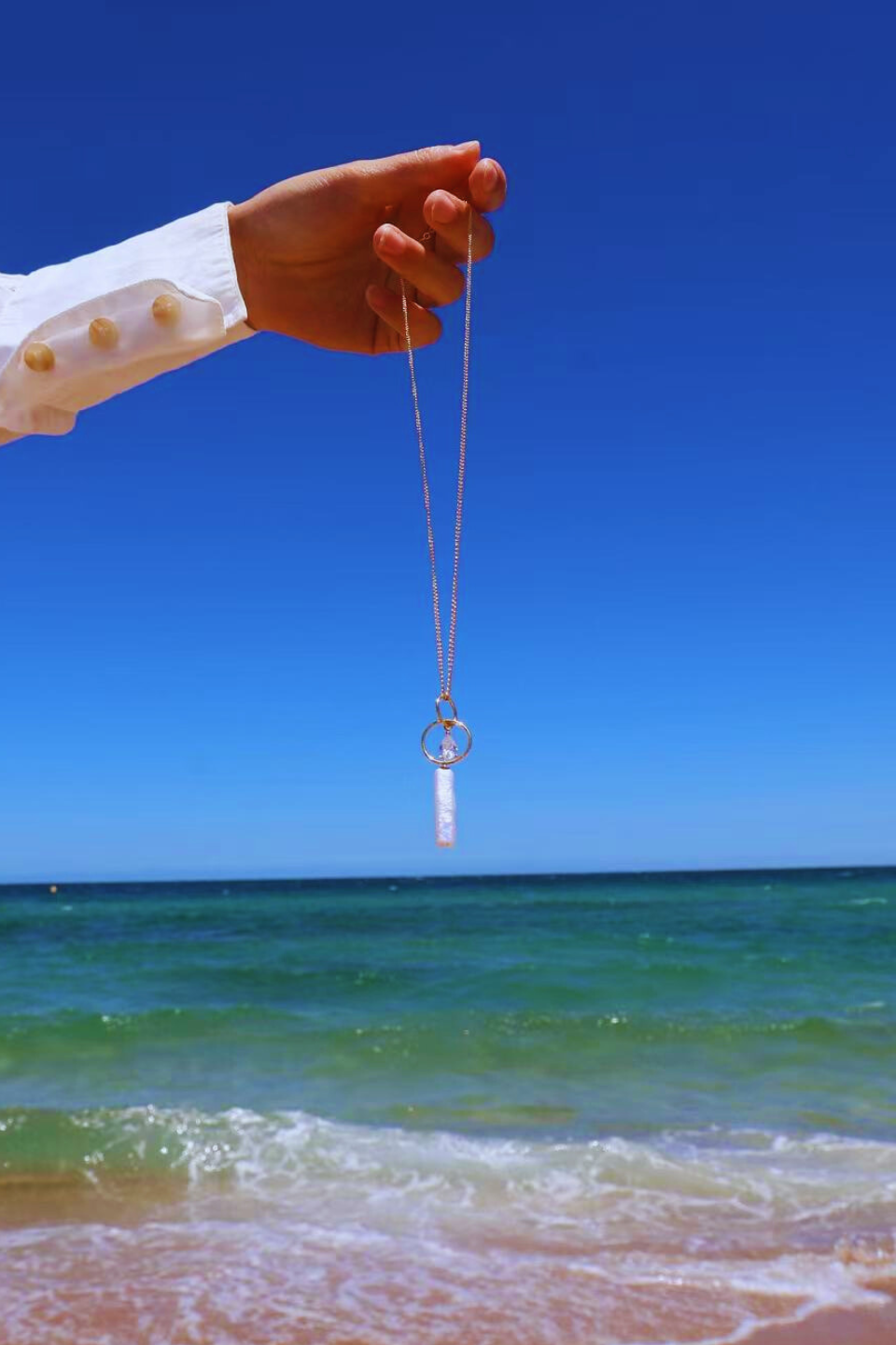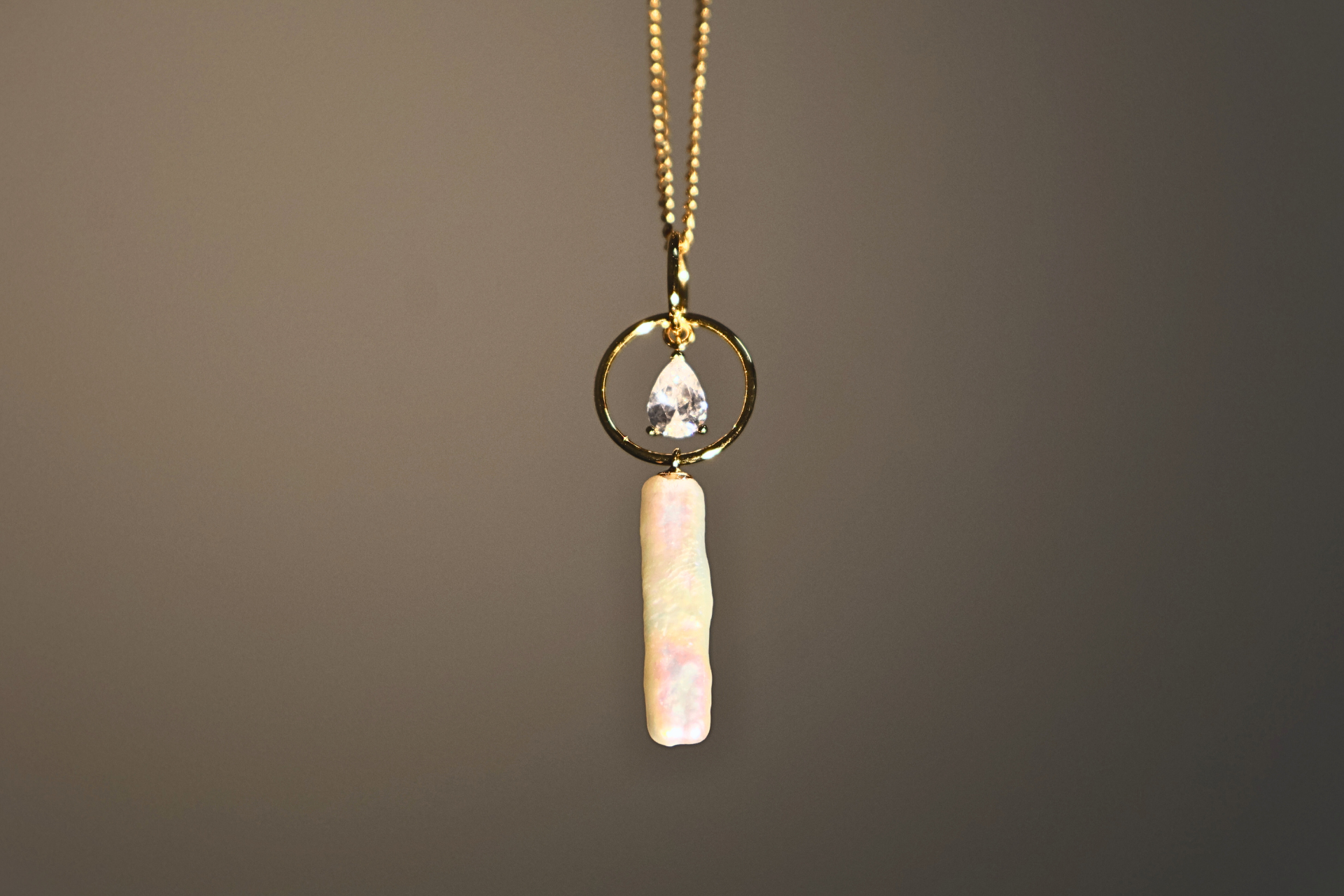 Stellar River features a striking rectangular baroque pearl pendant, accented with delicate pavé detailing that catches the light like distant stars. The elongated form creates a sense of flow and direction, while the organic surface of the pearl adds softness and individuality.